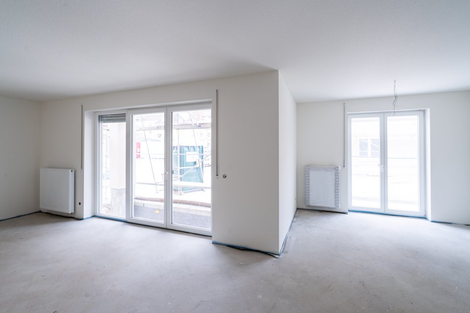 Beim Kopfbau sind zwischenzeitlich auch die Fenster im Erd- und Dachgeschoss vollständig montiert. Des Weiteren wurden die Hauseingangstüren der Hofhäuser und die Wohnungseingangstüren auf den Laubengängen des Kopfbaus geliefert und eingebaut. Auch die Außenputzarbeiten sind bei den südlichen Hofhäusern weiter fortgeschritten. Teilweise wurden hier schon Fassaden mit dem eingefärbeten Oberputz hergestellt, so dass sich die spätere Optik der Hofhäuser stellenweise schon erahnen lässt.
